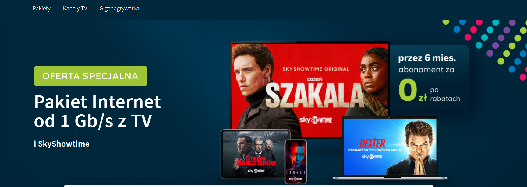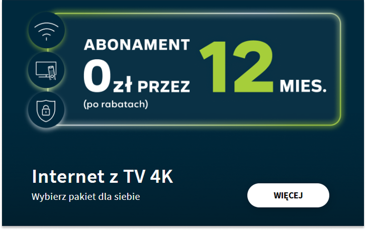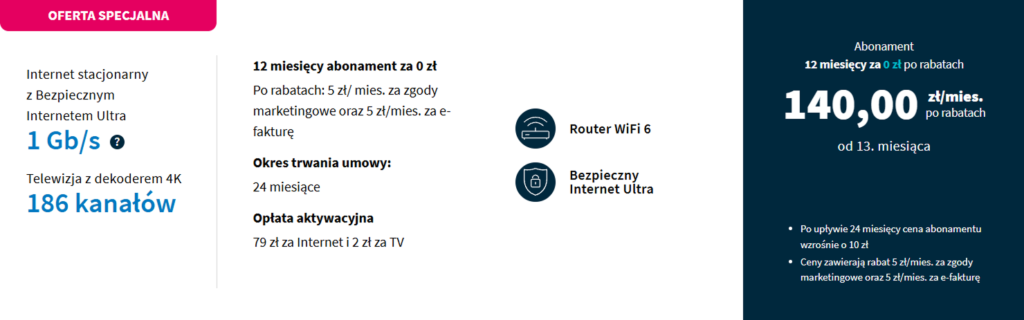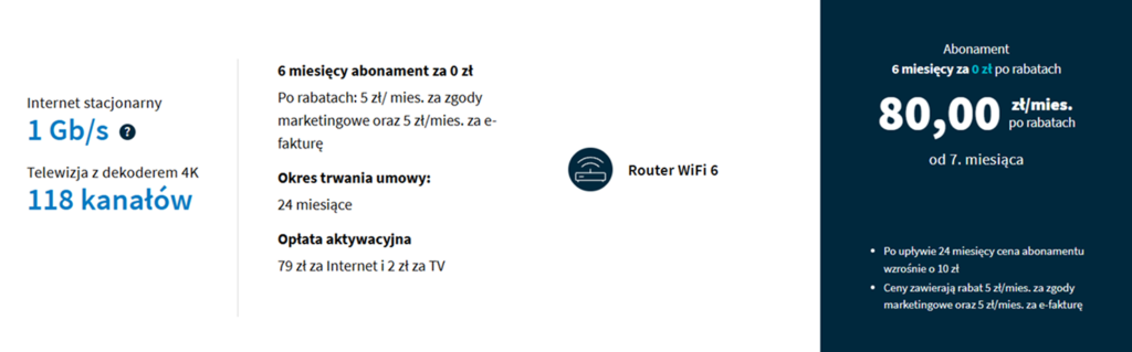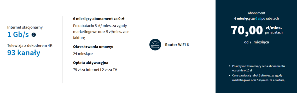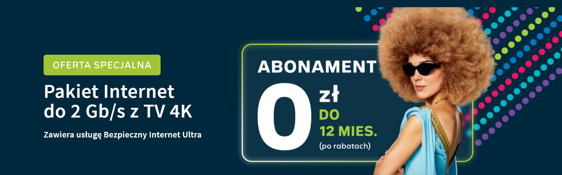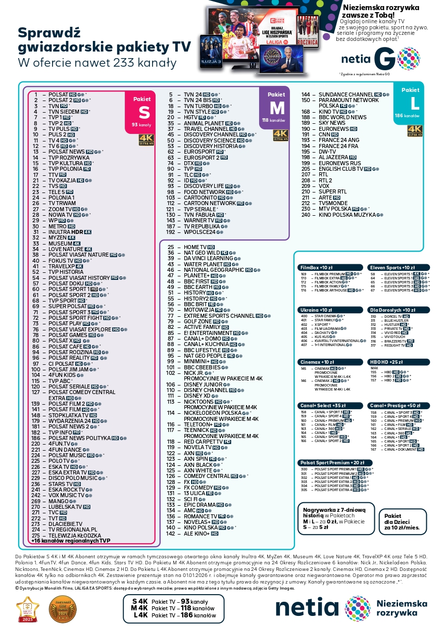 Prezentowana oferta Netii S.A.: „Wybierz szybszy Internet 6mies. 1/2Gb/s (PON, HFC, ETTH)”, „Wybierz szybszy internet (PON, HFC, ETTH)” obowiązuje przy zawarciu Umowy na czas określony 24 pełnych Okresów Rozliczeniowych przy jednoczesnym korzystaniu z rabatów za e-fakturę (5zł) i zgody marketingowe (5zł). W przypadku rezygnacji lub niespełnienia warunków przyznania rabatów, cena wzrośnie o 10 zł. Po 24 miesiącach cena abonamentu wzrasta o 10 zł. Szybki Internet Max (600, 1000, 2000) stanowi wyłącznie nazwę marketingową. Usługa Internetowa oparta jest na parametrach jakości wynikających z maksymalnych parametrów technicznych danej technologii, w jakiej świadczona jest Usługa Internetowa lub wynikających z ofertowych ustawień technicznych łącza. Prędkość 2 Gb/s jest dostępna na technologii PON. Parametry świadczenia Usługi Internetowej, w szczególności parametry prędkości oraz wpływu innych Usług na Usługę Internetową, dostępne są na stronie netia.pl. Oferta jest ograniczone terytorialnie do zasięgu stacjonarnej sieci PON, HFC, ETTH Operatora. Do Pakietów S 4K i M 4K Abonent otrzymuje w ramach tymczasowego otwartego okna kanały Inultra 4K, MyZen 4K, Museum 4K, Love Nature 4K, TravelXP 4K oraz Tele 5 HD, Polonia 1, 4fun.TV, 4fun Dance, 4fun Kids, Stars TV HD. Do Pakietu M 4K Abonent otrzymuje promocyjnie na 24 Okresy Rozliczeniowe 6 kanałów: Nick Jr., Nickelodeon Polska, Nicktoons, TeenNick, Cinemax HD, Cinemax 2 HD. Do Pakietu L 4K Abonent otrzymuje promocyjnie na 24 Okresy Rozliczeniowe 2 kanały: Cinemax HD, Cinemax 2 HD. Dostępność kanałów 4K tylko na odbiornikach 4K.